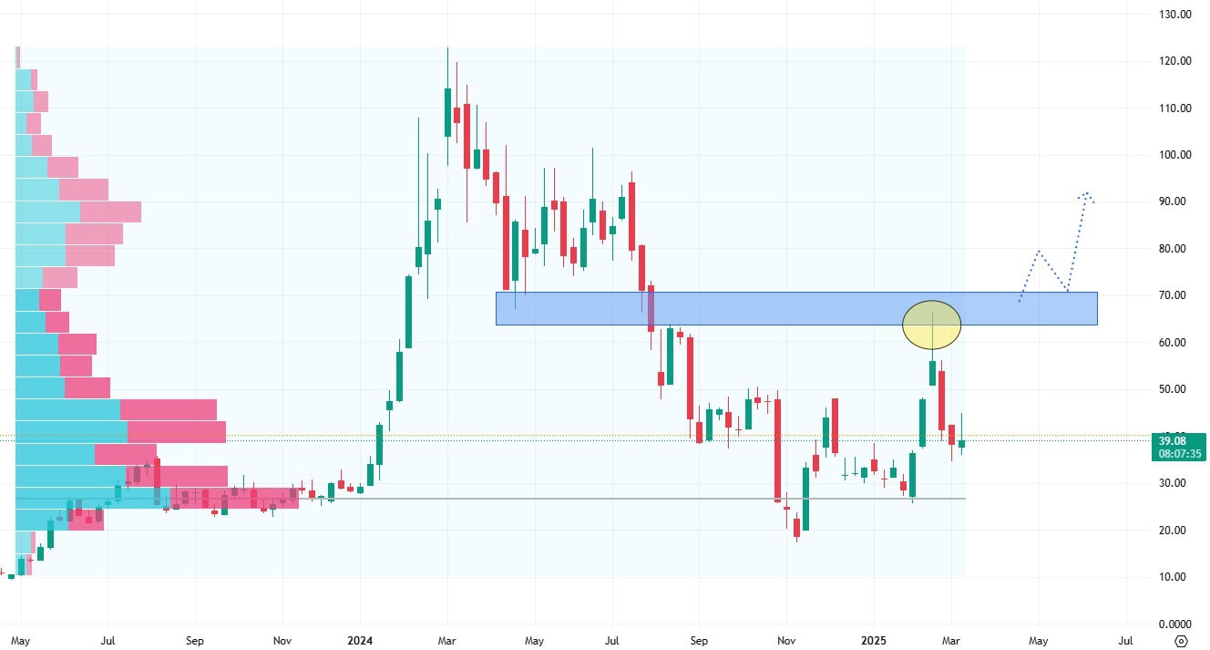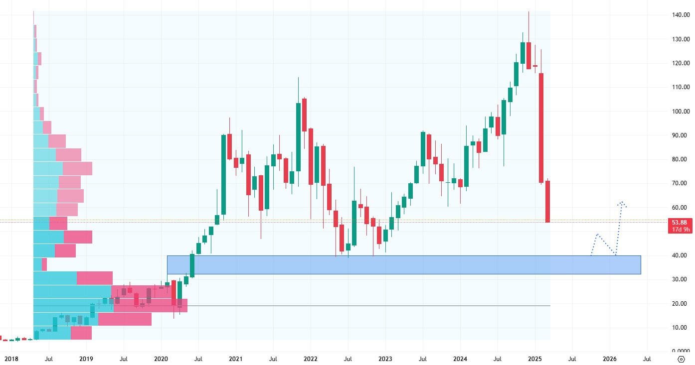 Akcie The Trade Desk se obchodují ve velmi výrazném cenovém propadu, který může ještě pokračovat. Nejbližší support se totiž nachází až na ceně 38 USD za akcii, kde cenová struktura tvoří konfluenci mezi hranou volume profilu a swing low.
