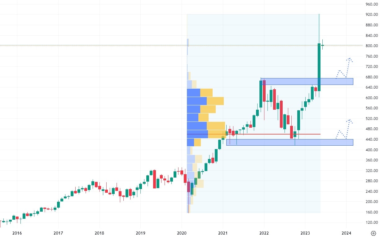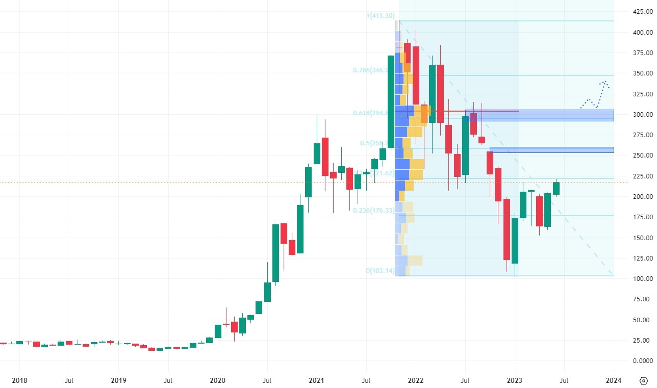 Akcie Tesla celý letošní rok rostou ze svého minima z přelomu roku. Nejbližší cenová úroveň, která může v jejich růstu bránit, se nachází na hodnotě 250 USD a tvoří ji neuzavřený prodejní gap, který je v konfluenci s 50 % Fibonacciho retracementu. I na další úrovni retracementu se nachází rezistence, která je ovšem tvořena cenovými maximy z poloviny loňského roku.