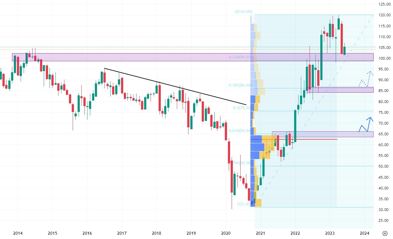 V letošním roce to vypadá, že dvouletý akciový růst bude ukončen. Akcie ExxonMobilkonsolidují na vrcholu svého cenového růstu s tím, že již otestovaly hodnotu nejbližšího supportu. Pokud dojde k výraznější cenové korekci, může dojít k pádu až na hodnotu 85 USD, kde se nachází cenová minima a 38,2 % Fibonacciho retracementu. Pokles pod tuto hodnotu by již znamenal konec růstového sentimentu na těchto akciích.