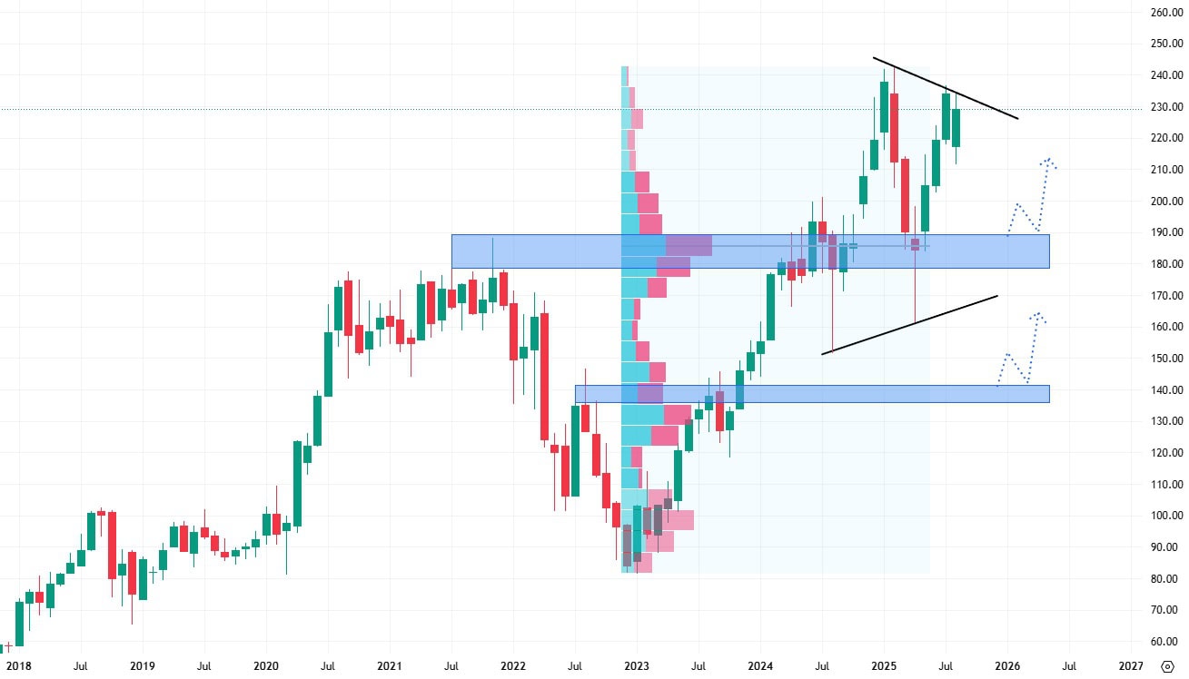 Nevýhodou těchto akcií je již jednou otestovaný nejbližší support, což může být problém pro případný cenový pokles. Pád akcií pod hodnotu 180 USD, by mohl značit down trend.