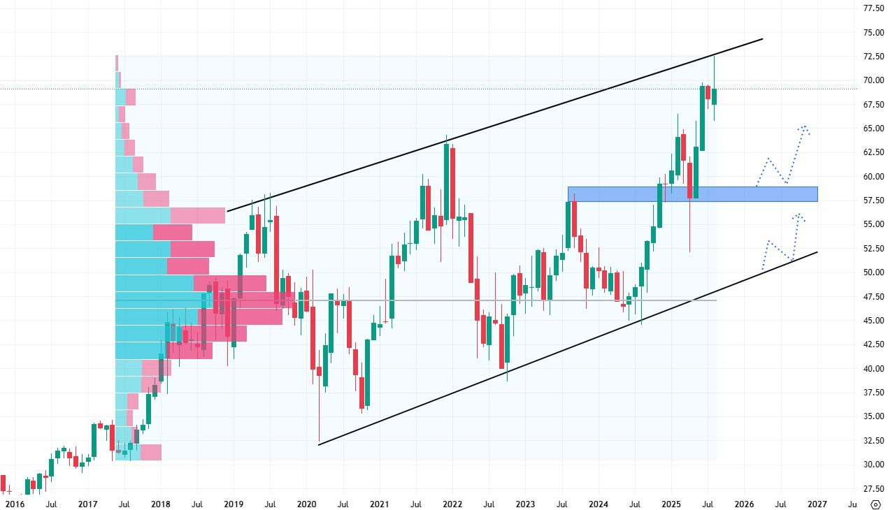 Nejbližší support se nachází až na ceně 60 USD za akcii, ovšem byl jednou již otestovaný, což může snižovat jeho validitu. V případě výraznější prodejní korekce může ještě důležitou roli sehrát spodní hrana trendového kanálu.