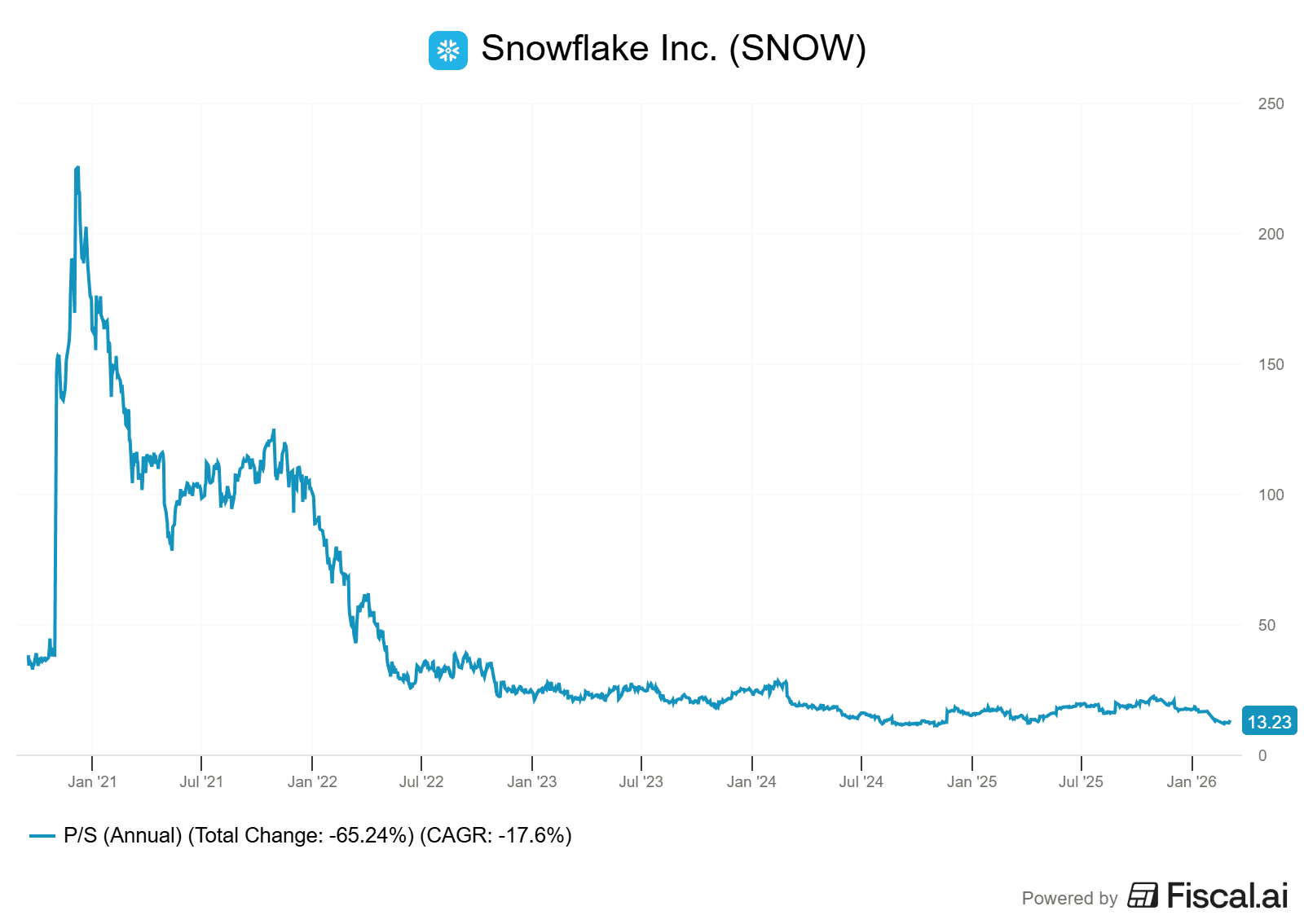 Akcie Snowflake se v současnosti obchodují za zhruba 13,2násobek tržeb (ukazatel P/S), což je sice jejich téměř tříleté minimum, ale z historického i tržního hlediska jde stále o mimořádně vysokou hodnotu.