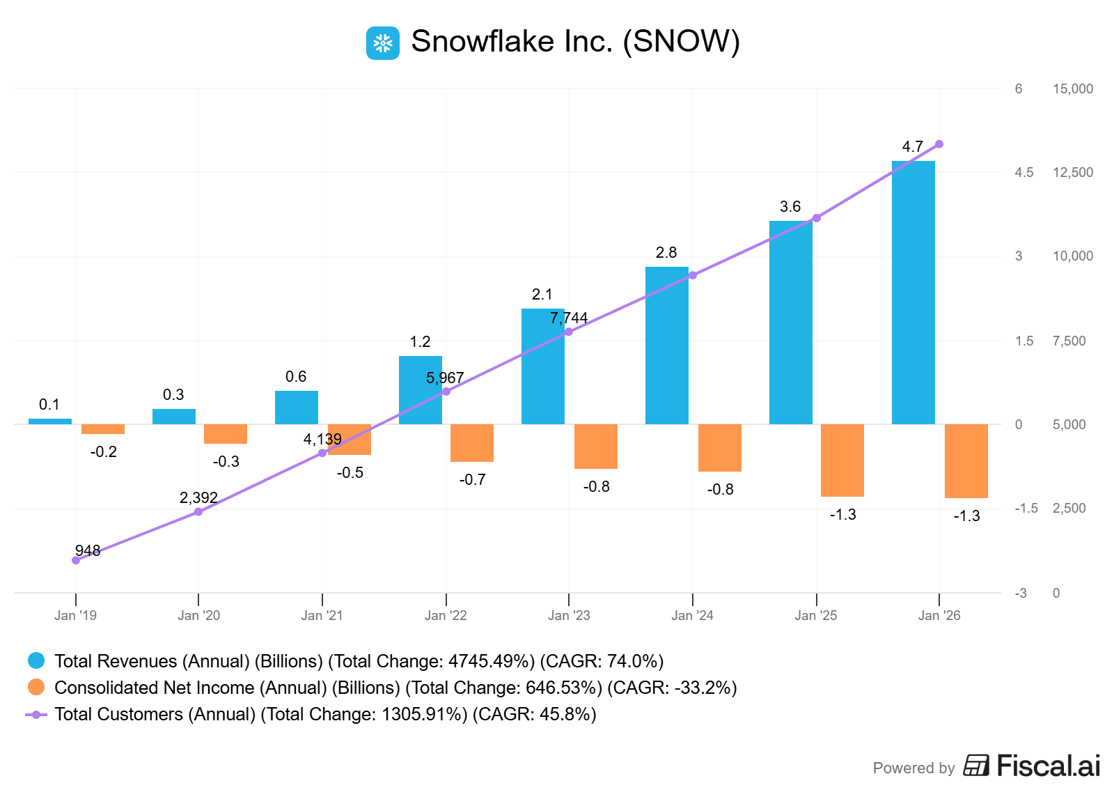 V důsledku toho Snowflake vykázal masivní ztrátu ve výši 1,3 miliardy dolarů. Pokud bychom však nebrali v potaz jednorázové výdaje a nehotovostní (non-cash) náklady, čistý zisk by činil 465,9 milionu dolarů.