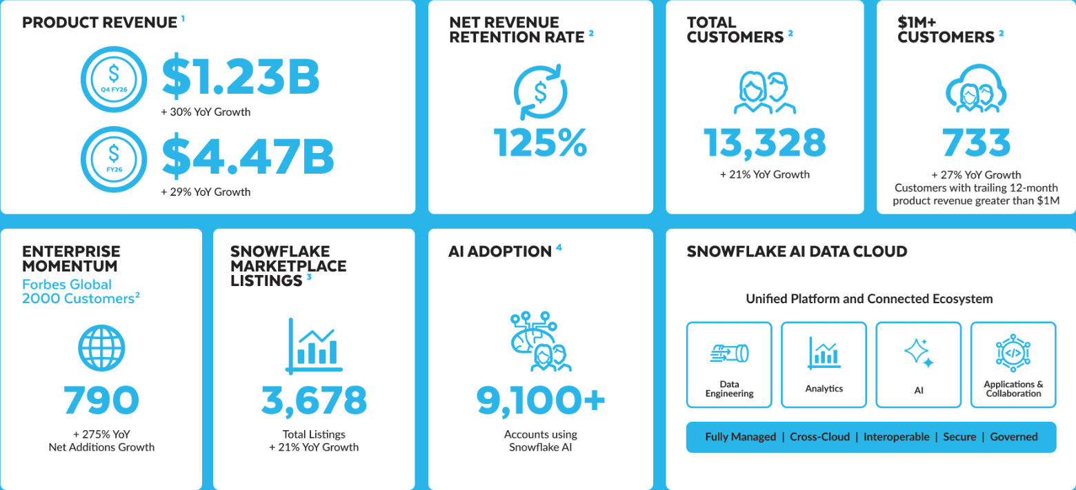 Výsledky Snowflake za rok 2026 na první pohled ukazují solidní růst. Tržby dosáhly 4,5 miliardy dolarů, což představuje meziroční nárůst o 29,1 % (ve srovnání s 29,8% růstem v roce 2025).