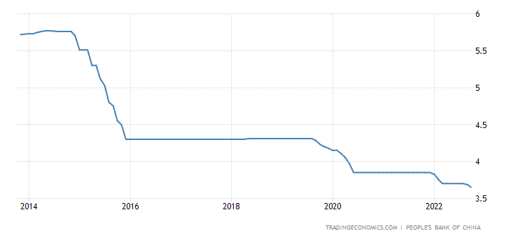 Nyní díky covidu i nemovitostní bublině se snaží svoji domácí ekonomiku stimulovat a mírně snižuje svoje sazby. Ty v současnosti dosahují 3,65 %. Avšak čínská inflace je záporná – 0,1 %. Deflace v Číně je způsobena velmi tvrdými lockdowny, které omezují lidi v nakupování, a tak drží inflaci při zemi. Čína má tedy pořád reálné úrokové sazby kladné. Čínská centrální banka tak naplňuje cíl, který si nyní vytyčil americký Fed. Z tohoto pohledu je Čína před Amerikou.