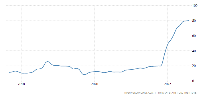 Možná vás to překvapí, ale Turecko našlo svoji cestu. Turecko se při inflaci 80 % rozhodlo jít proti ekonomickým poučkám. Normálně by se dalo čekat, že turecká centrální banka bude své sazby zvedat, aby porazila inflaci. Turecký prezident Erdogan však rozhodl jinak. Nesmí se sazby zvyšovat, ale naopak snižovat. Turecko snížilo za poslední měsíce svoji sazbu z 19 % na 12 %.