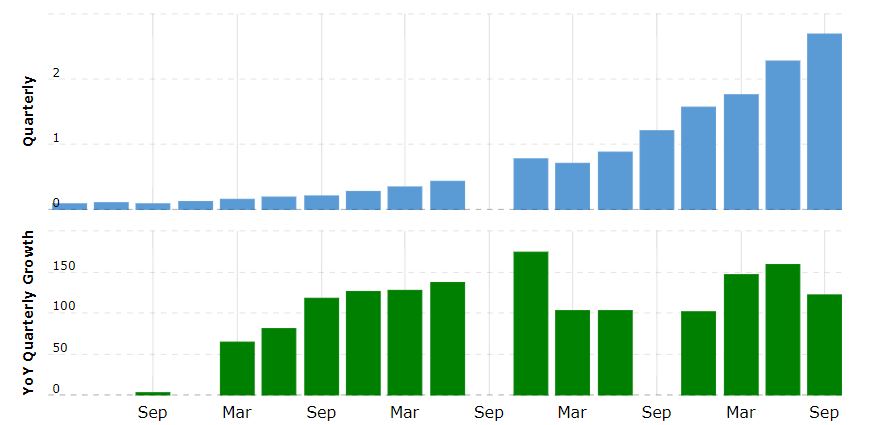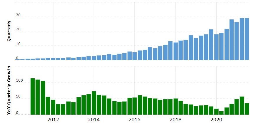 Za 3. čtvrtletí 2021 společnost Shopify vykázala růst tržeb o 46 % na 1,1 miliardy dolarů. Důležité je zmínit, že měsíční opakující se tržby (MMR) společnosti jenom v září 2021 činily 98,8 milionu dolarů. Vztáhneme-li toto číslo na celý rok – činí roční opakovaný příliv peněz do společnosti 1,2 miliardy dolarů. Vzhledem k nárůstu počtu podniků využívajících Shopify a přechodu řady podniků do online prostoru je pravděpodobné, že růst MRR zůstane silný. Shopify je tedy dalším strojem na vytváření peněžních toků.