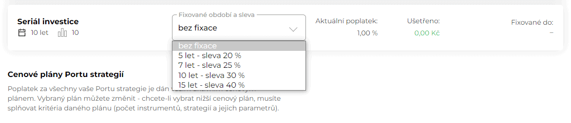 Poplatky jsou obecně u investičních platforem velmi nízké, zpravidla okolo jednoho procenta ročně z aktuální hodnoty, bez vstupních či výstupních poplatků (vyjma kryptoměnového Fumbi). Přesto ale Portu nabízí zajímavou možnost. Klienti si u svého portfolia mohou zapnout fixaci a tím ještě snížit poplatky (až o 40 %).