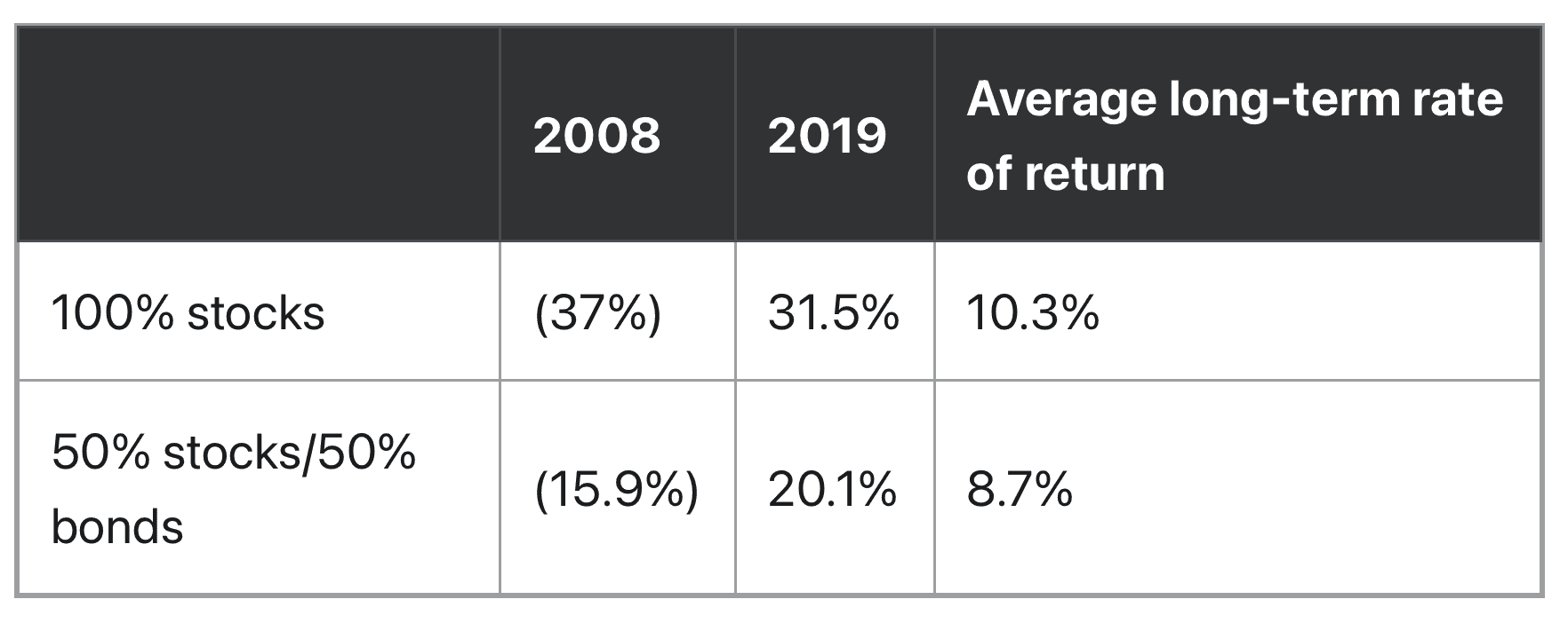 Tabulka níže zobrazuje rozdíl mezi portfoliem 100 % akcií oproti portfoliu 50 % akcií a 50 % dluhopisů během medvědího trhu v roce 2008, býčího trhu v roce 2019 a průměrné výkonnosti trhu.