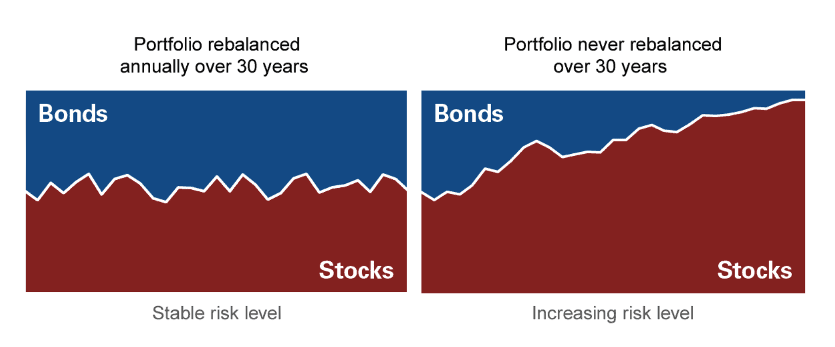 Pokud by investor tuto aktivitu úplně zanedbal, postupem času by jeho portfolio bylo s velkou pravděpodobností čím dál tím rizikovější, neboť akcie na delším horizontu zpravidla rostou více než ostatní třídy aktiv. To dokládá následující modelace, která simuluje vývoj dvou portfolií s počáteční váhou akcií a dluhopisů 50:50 na třicetiletém horizontu. Bez rebalancování se z vyváženého portfolia stalo téměř výhradně akciové.