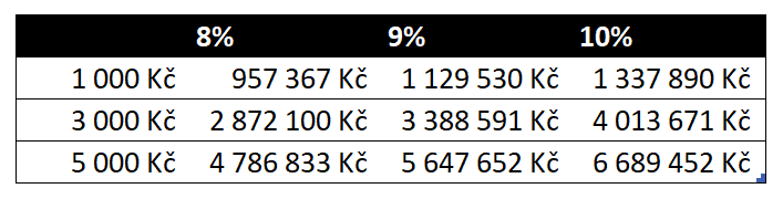 Konkrétně pokud tedy budeme pravidelně měsíčně investovat 5000 korun, díky složenému úročení se za 25 let dostaneme při výnosu 10 % na částku přes 6 a půl miliónů korun.