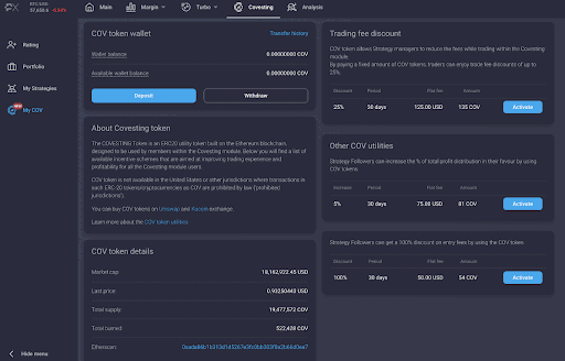COV token umožňuje odemknout extra benefity, jako jsou například bezpoplatkové vstupy, vyšší podíl na poplatcích nebo podstatně snížené obchodní poplatky pro Strategy managery. Postupné pálení tokenů znamená, že jejich zásoba je omezená a navíc se pomalu zmenšuje.