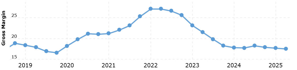 Hrubé marže klesají prakticky od poloviny roku 2022 a aktuálně dosahují 17,4 %. Případné další zhoršení tohoto ukazatele by mohlo akcie Tesly negativně ovlivnit.