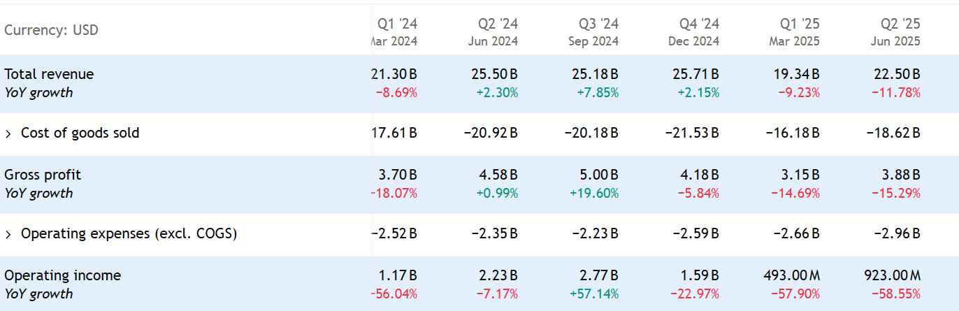 Dopad na ziskovost byl ještě silnější. Růst provozního zisku klesl v posledních třech čtvrtletích a v Q2 2025 činil pokles 58 %.
