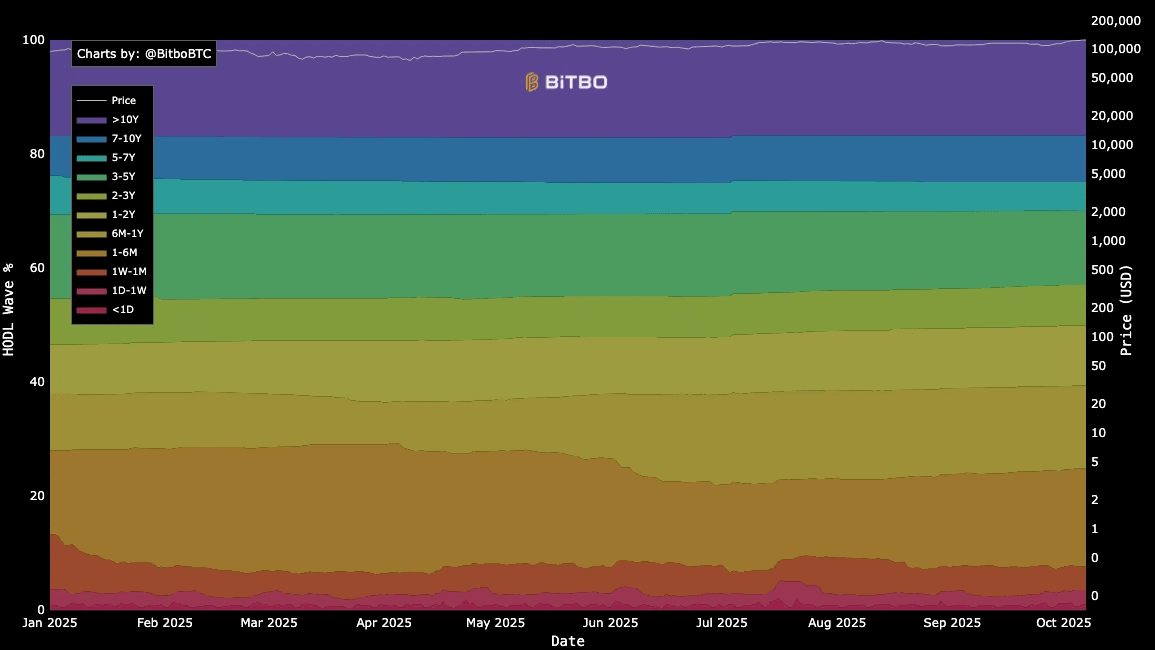Tzv. HODL Waves, což je rozdělení investorů do Bitcoinu podle doby, kdy aktivum pořídili, ukazují, že má skupina investorů držících tuto kryptoměnu více než 10 let v kryptoměnových peněženkách 17 % nabídky BTC.