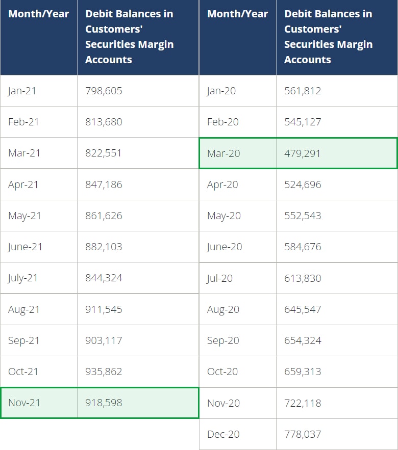 V průběhu času je naprosto normální, že výše nesplaceného maržového dluhu stoupá. Od března 2020 se však jeho výše téměř zdvojnásobila a nyní dosahuje téměř 919 miliard dolarů, jak vyplývá z listopadových údajů Financial Industry Regulatory Authority.