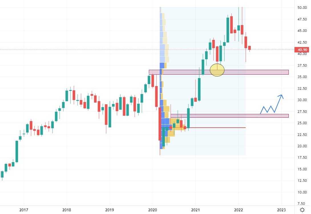 Růst akcií Bank of America se prozatím zastavil a z technického pohledu nepřináší moc dobré zprávy. Trh totiž již v minulosti testoval nejbližší supportní zónu na ceně 36 USD s tím, že další nejbližší support se nachází až na ceně 26 USD, kde je rovněž i nejvyšší Volume oblast. Vývoj tržeb je konstantní a pohybuje se okolo 94 miliard USD s aktuálním meziročním růstem 26,28 %. Tato společnost poskytuje bankovní služby pro malé, střední i velké společnosti a nabízí i finanční služby pro korporátní a vládní instituce.