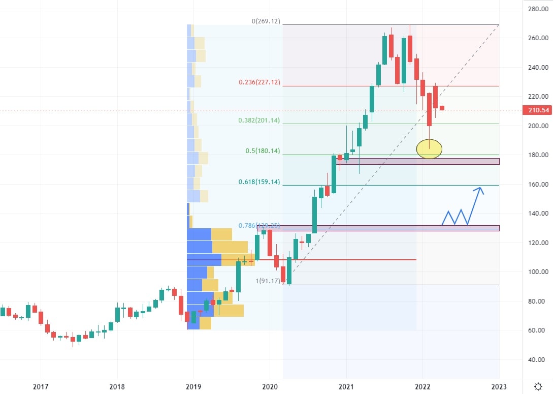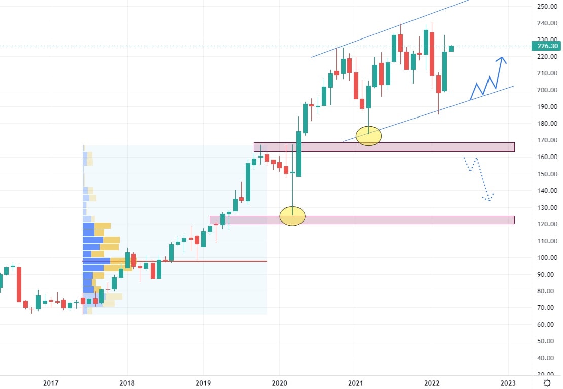 Akcie Dollar General se obchodují v rostoucím trendovém kanálu. Co se týče dlouhodobé stability tržeb, jedná se o nejkonzistentnější společnost v tomto článku. Meziroční růst se pohybuje okolo 1,4 %, což představuje predikovanou částku pro 34,2 miliardy USD pro rok 2022. Dollar General je diskontní společnost, která napříč USA prodává produkty spotřebního sortimentu.