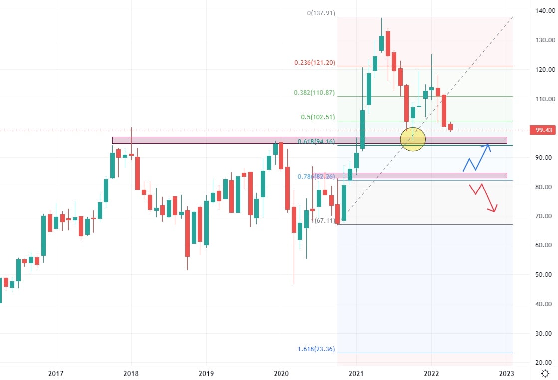 Akcie Oshkosh se obchodují v klesajícím trendu, který v současné době provádí již druhý test supportní zóny. Vzhledem tomu, že podpůrná schopnost je již druhým testem značně snížena, lze očekávat pokles na další support, na cena 85 USD, který je v konfluenci s 78,6 % Fibonacciho retracementu. Meziroční nárůst tržeb je u této společnosti 18 % a současné výsledky i budoucí predikce tržeb jsou ustálené okolo 8 miliard USD. Oshkosh se specializuje na výrobu speciálních vozidel a karosérií, jako jsou například pracovní plošiny nebo dálkové manipulátory.