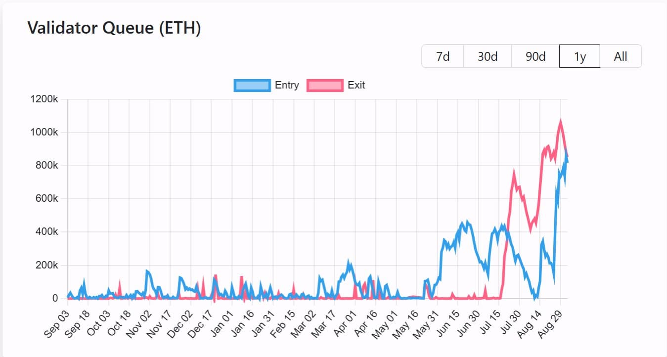 V případě Etherea je aktivita treasury firem u stakingu opravdu znát. Množství ETH, které čeká ve frontě na to, aby mohlo být stakováno, dosáhlo začátkem tohoto měsíce nejvyšší úrovně od září 2023.