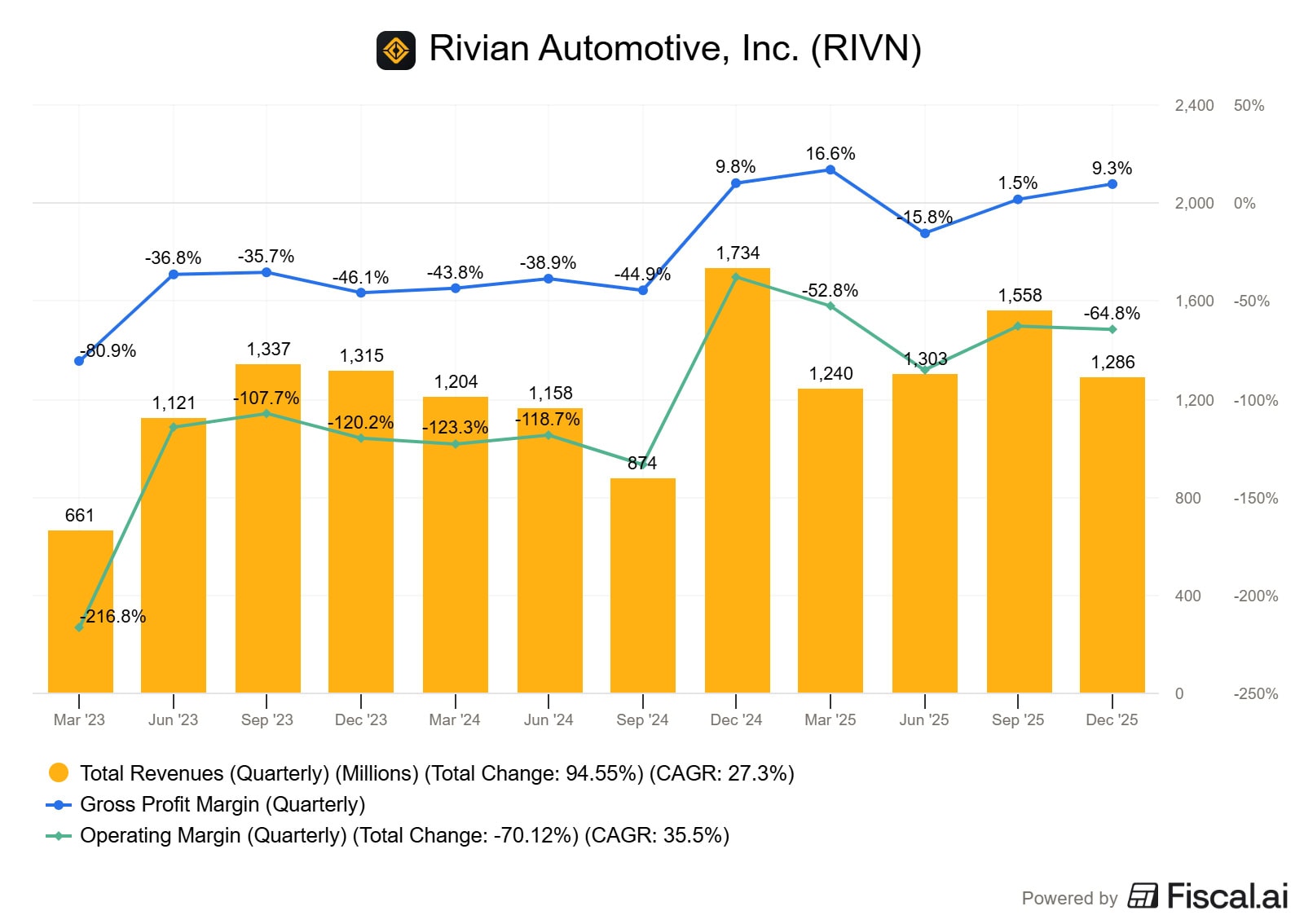 Na úrovni tržeb je zřetelně vidět, že jednotlivá čtvrtletí vykazují výrazné výkyvy. To naznačuje, že Rivian stále naráží na typické problémy automobilek v rané fázi – trápí ho zejména kolísání dodávek, obtížná optimalizace produkce a složitá logistika.