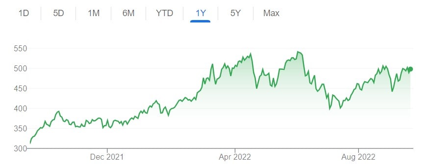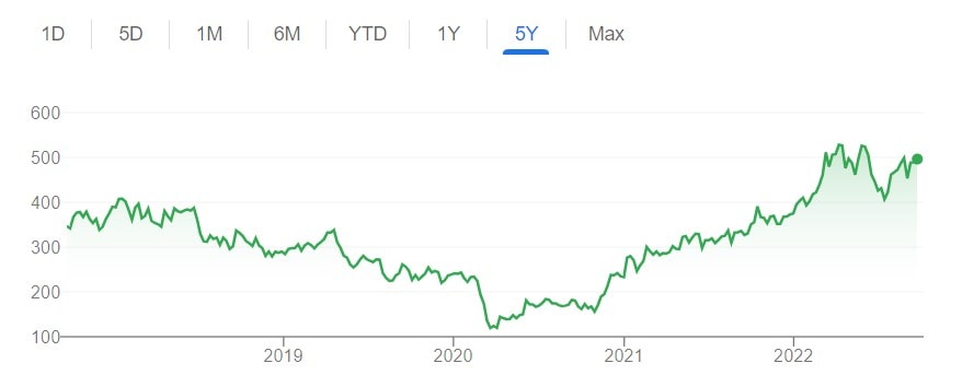 Vysoká dividenda by mohla naznačovat také výrazný předchozí propad ceny akcií, to však pro akcie Glencore neplatí. Při pohledu na roční cenový vývoj (výše) a pětiletý cenový vývoj (níže) je zjevné, že se cena akcií tohoto těžaře v poslední době výrazně nepropadla.