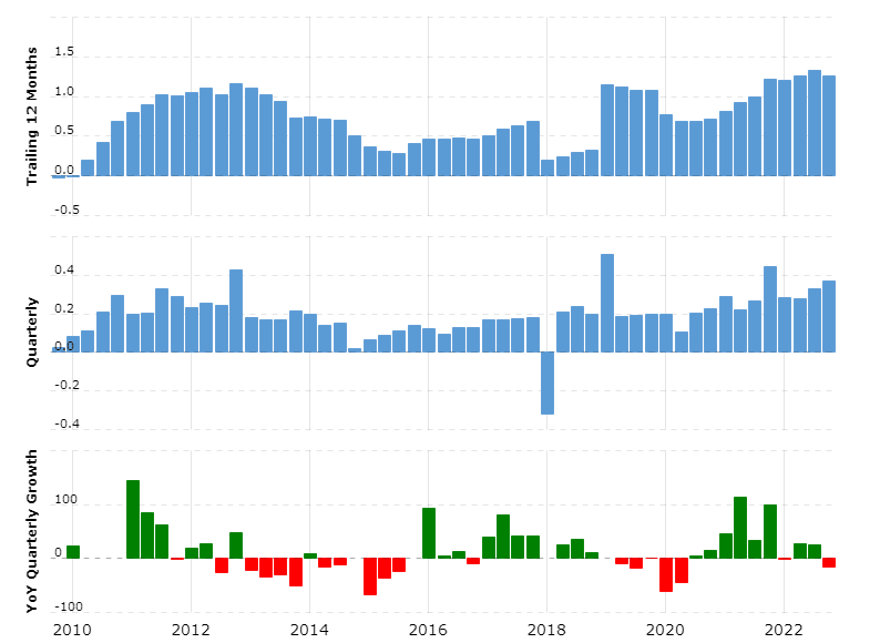 Všimněte si, že společnost utrácí více peněz na zpětný odkup akcií než na dividendy. V roce 2022 bylo na dividendy přiděleno přibližně 250 milionů USD a na program zpětného odkupu 1,13 miliardy USD.