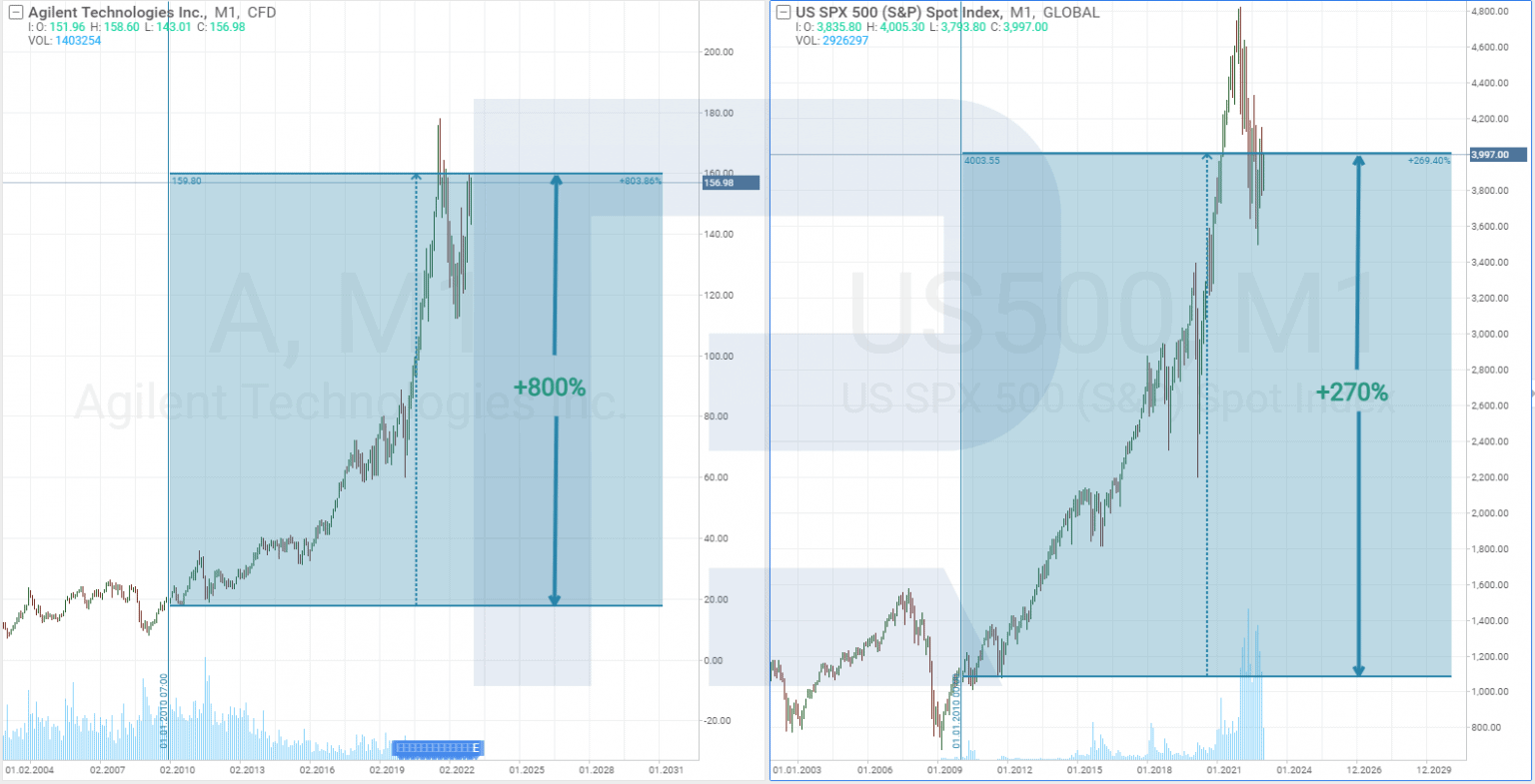 Lze konstatovat, že při takovém způsobu financování poskytují cenné papíry společnosti dobrý výnos. Na níže uvedeném grafu totiž můžeme vidět, že od roku 2010 zaznamenaly akcie Agilent Technologies pozoruhodný růst o 800 %, zatímco index S&P 500 vzrostl o pouhých 270 %.