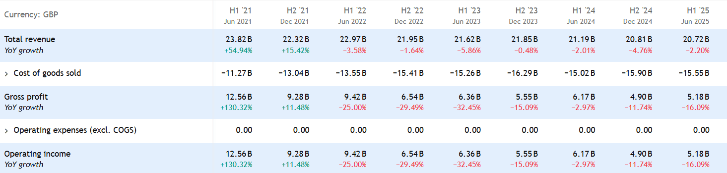 Slabší trend pokračoval i v první polovině roku 2025. Tržby dosáhly 20,7 miliardy GBP, což je meziroční pokles o 2,2 %.