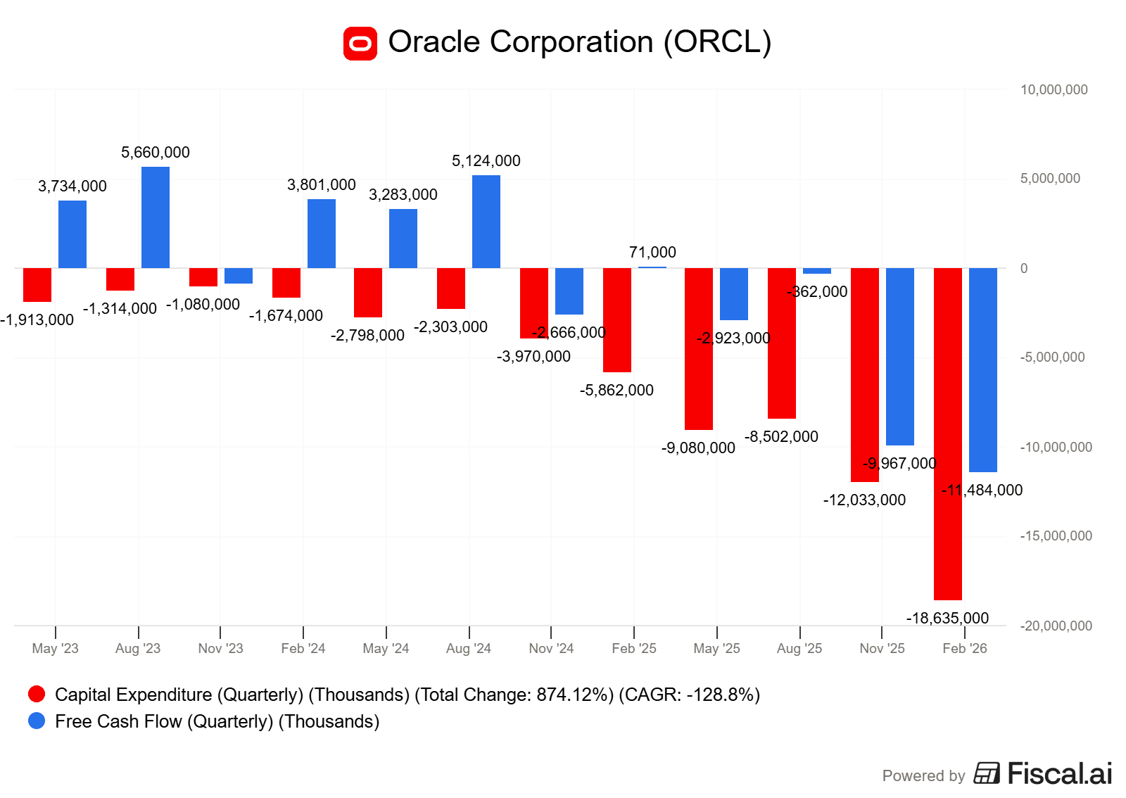 Tyto extrémně vysoké investice se však pochopitelně propisují do volného cash flow, které je za posledních 12 měsíců v hlubokém záporu ve výši 13,18 miliardy dolarů.