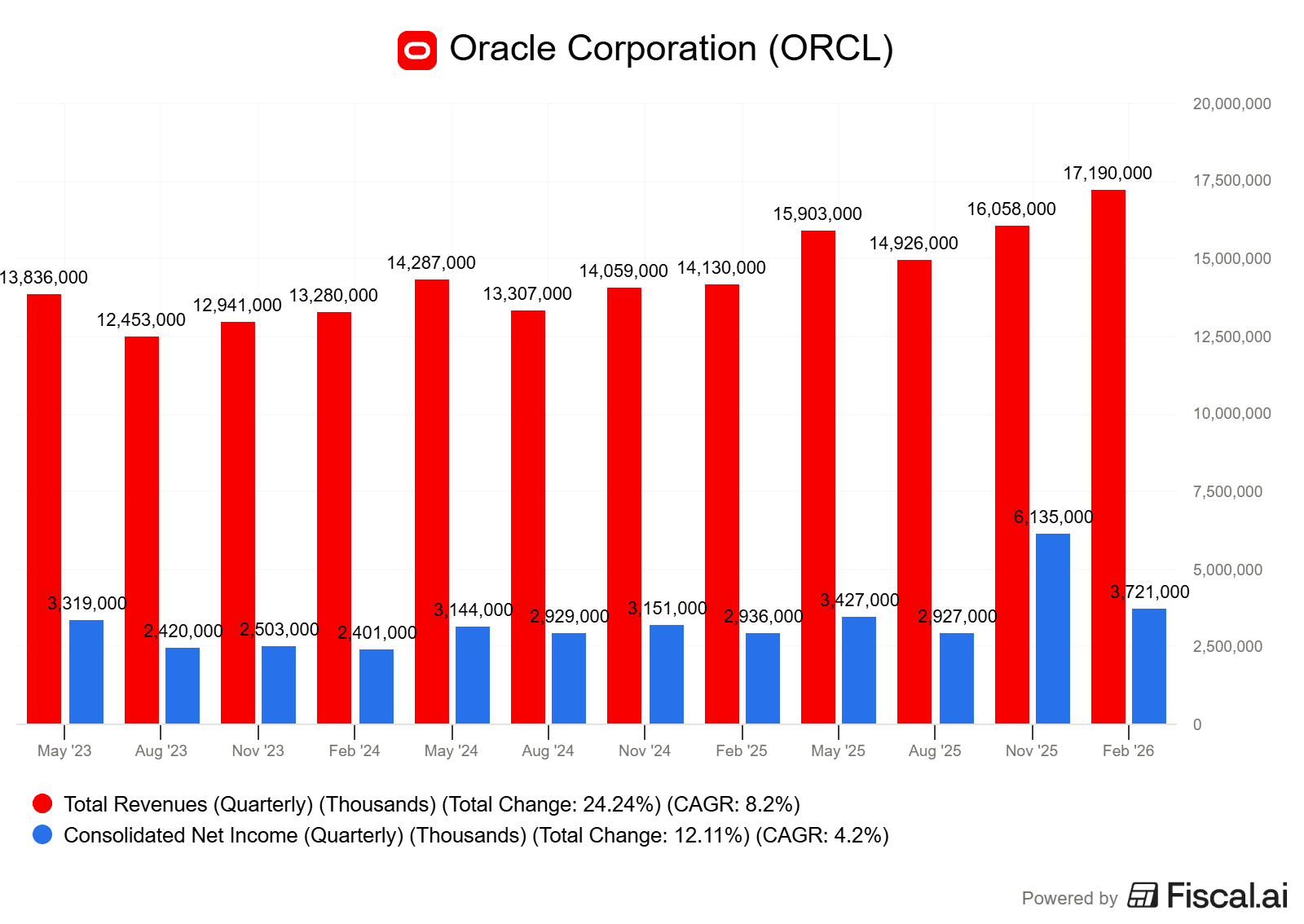 Pro čtvrté fiskální čtvrtletí Oracle aktuálně předpokládá upravený zisk na akcii v rozmezí 1,92 až 1,96 dolaru a růst celkových tržeb mezi 19 % a 20 %.