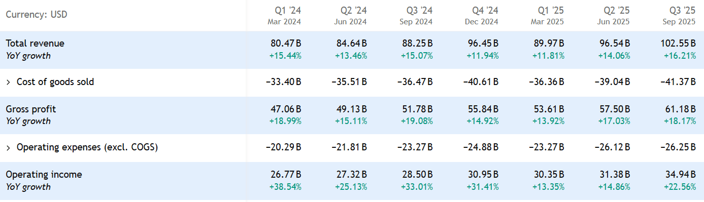 Výsledky Alphabetu za třetí čtvrtletí ukazují, že investice do umělé inteligence přinášejí výsledky. Společnost vykázala 16% nárůst tržeb, které dosáhly 102 miliard dolarů, přičemž provozní marže byly upraveny směrem nahoru na 34 %.