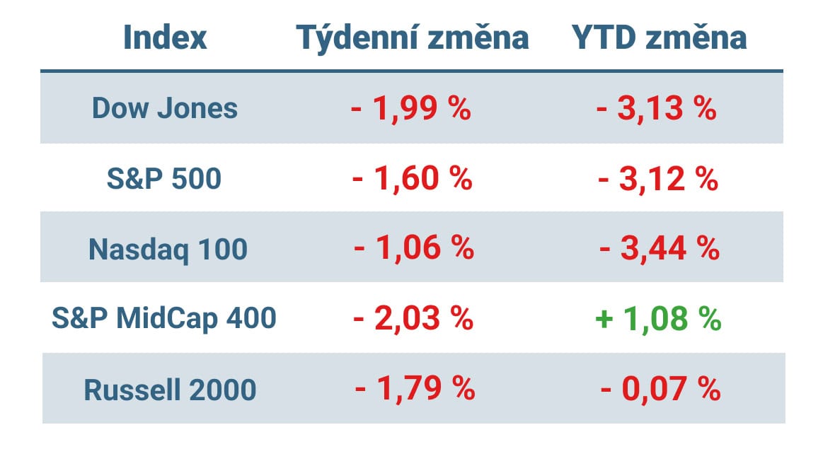 Tabulka ukazuje vývoj nejvýznamnějších amerických indexů v uplynulém týdnu a od začátku roku