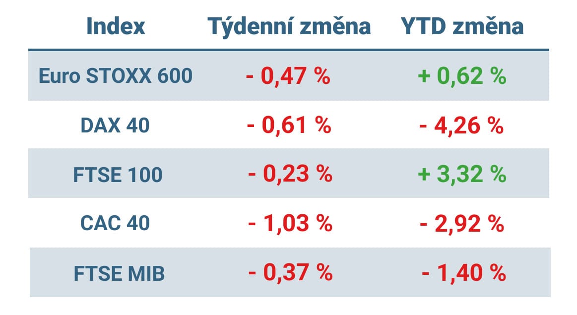 Tabulka ukazuje vývoj nejvýznamnějších evropských indexů v uplynulém týdnu a od začátku roku