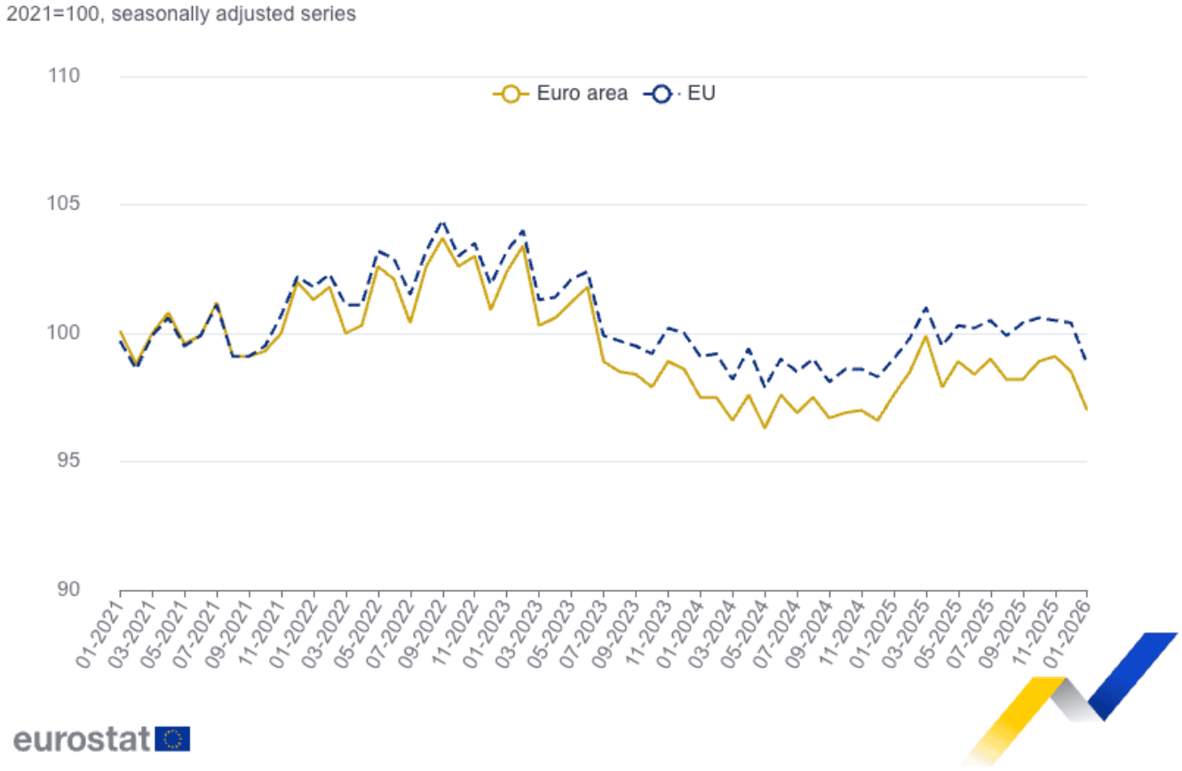 V rámci eurozóny padala hlavně výroba kapitálového zboží, meziproduktů a zboží krátkodobé spotřeby, kdežto energetická výroba naopak rostla.