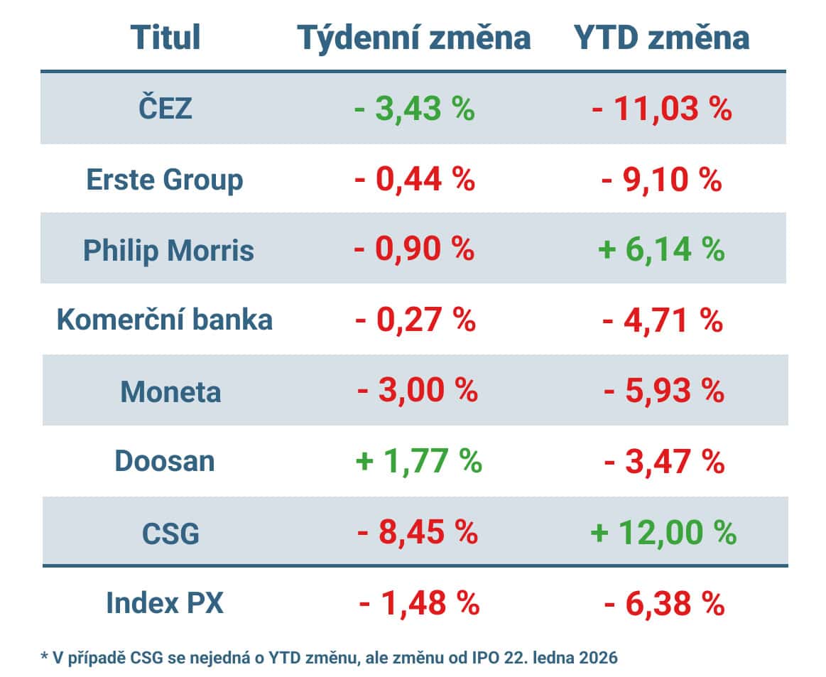 Pražská burza měla v týdnu spíš obranný režim a index PX oslabil. Největší brzdou byly banky: Erste Group, Komerční banka i Moneta zakončily týden v minusu, takže domácí trh působil unaveněji, než by si investoři přáli.