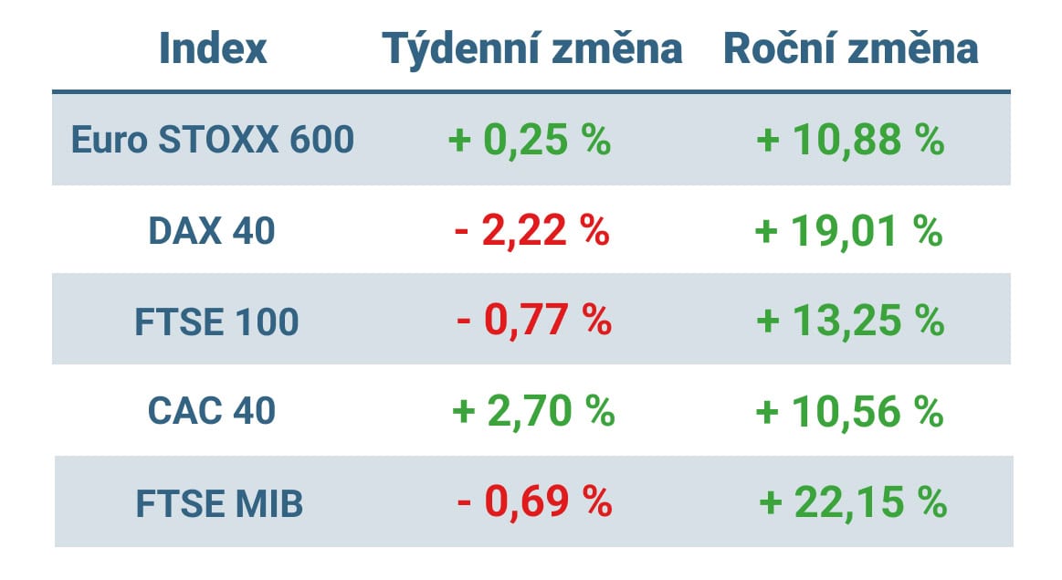 Tabulka ukazuje vývoj nejvýznamnějších evropských indexů v tomto týdnu a v roce 2025
