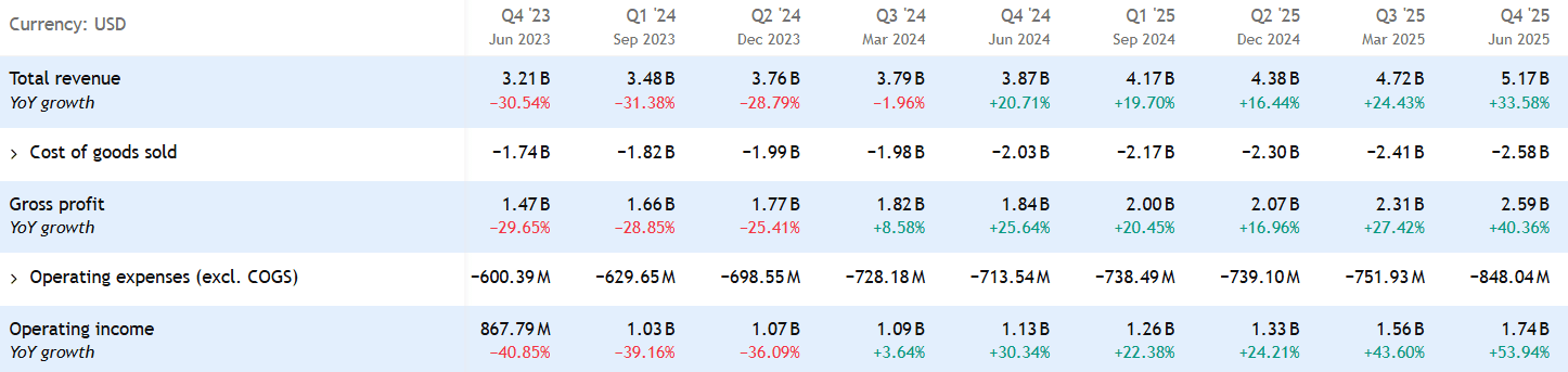 Díky tomuto růstu dosáhly tržby 5,2 miliardy dolarů a rekordní hrubé marže 50,3 %.