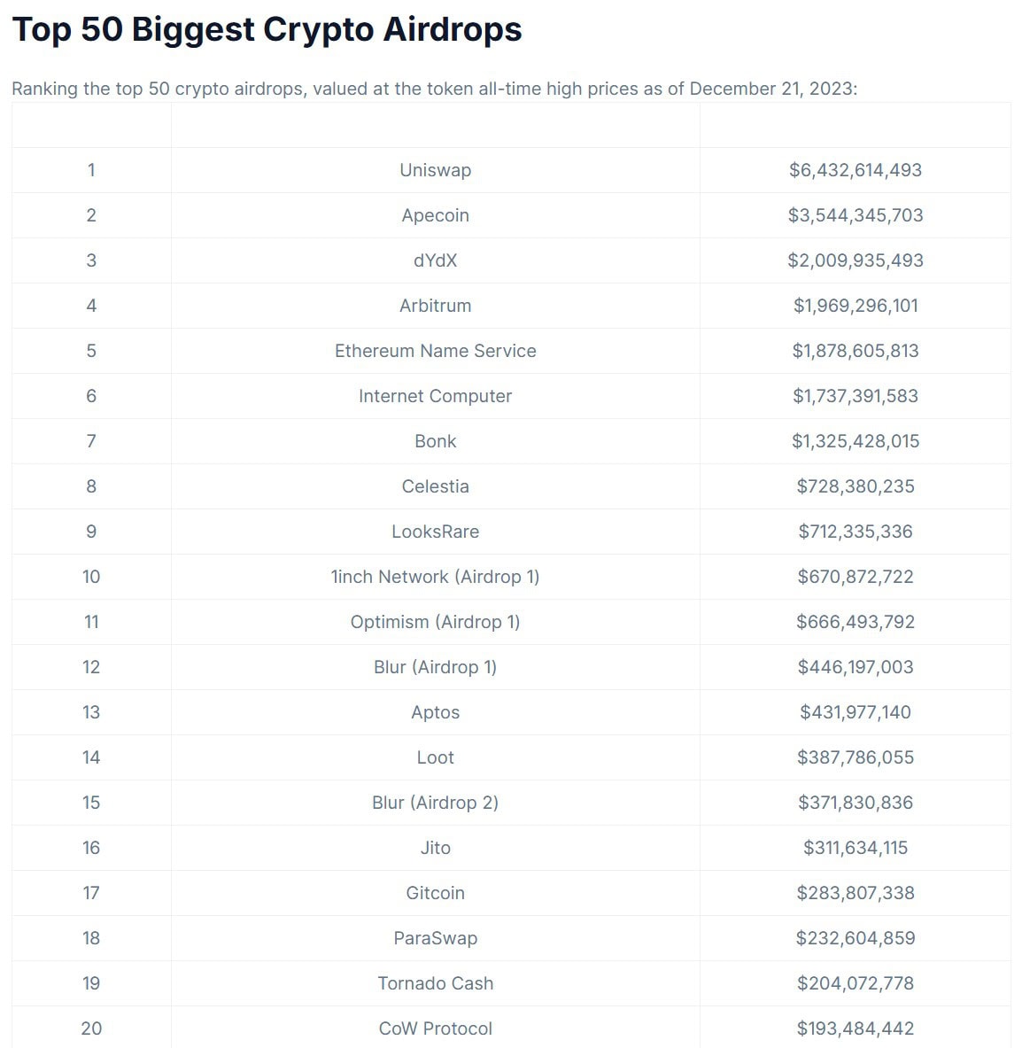 Níže se nachází příklady několika z největších airdropů, které kdy vznikly, jaké byly podmínky získání a jak byl aidrop výnosný v čase.