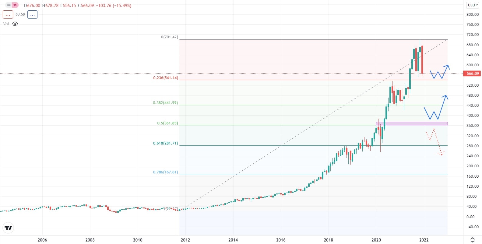 Další nejbližší supportní zóna, kde se dají z technického pohledu akcie Adobe nakoupit, se nachází na ceně 380 USD za akcii. Tato úroveň rovněž nabízí konfluenci s 50 % Fibonacciho retracementu. Otázkou by v případě tohoto scénáře bylo, co by se muselo stát, aby cena akcií klesla až na tuto úroveň.