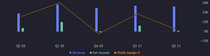 Hospodářský výsledek za druhý účetní kvartál (třetí kalendářní) byl jedno velké zklamáni. Výnosy dosáhly sice pěkných 31 miliard USD, ale zisk činil pouhých 829 milionů USD. Mezikvartálně se jedná o 88% pokles. Pokud bychom tedy měli hledět pouze na výnosy, jedná se o jeden z nejlepších kvartálů v historii firmy.