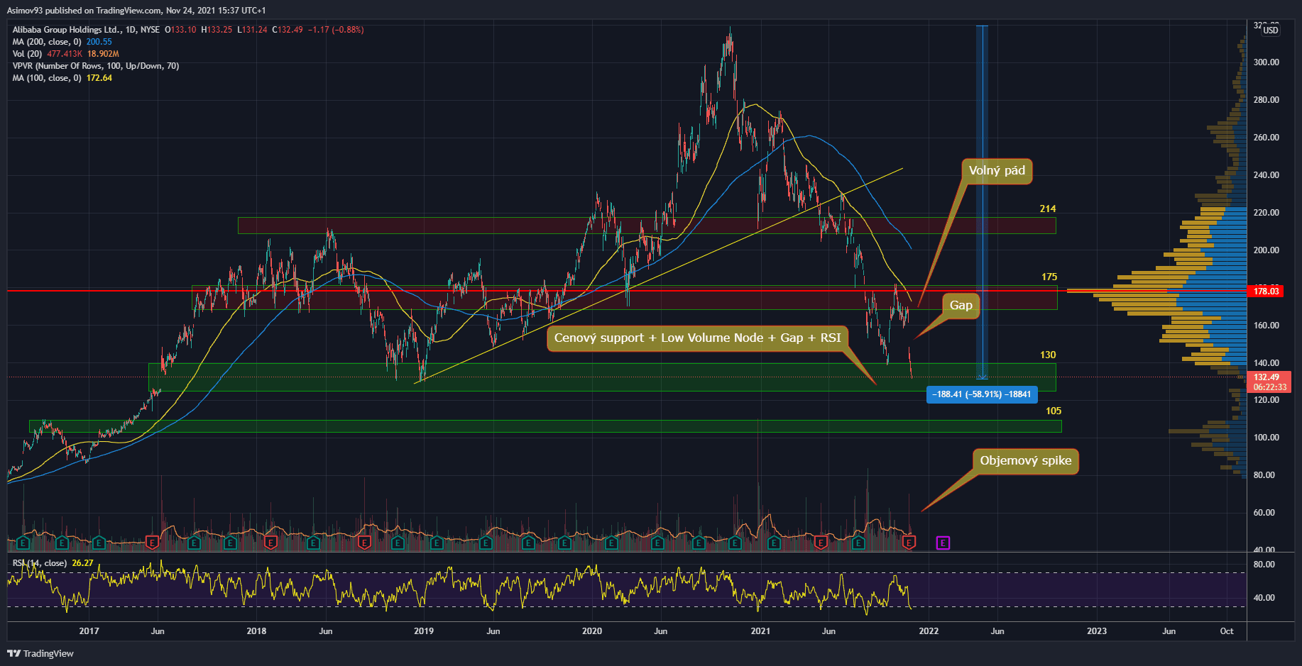 Respektive ta pravděpodobnost odrazu je zde mnohem větší. Pokud by ale nakonec support nevydržel, další zastávka je až S/R level 105 USD. Tady je taktéž konfluence díky high volume node na objemovém profilu. Nemyslím si však, že akcie Alibaba klesnou tak nízko. Už nyní je celková ztráta téměř 60 %. Přitom má ta firma čtvrtletní výnos přes 30 miliard USD.