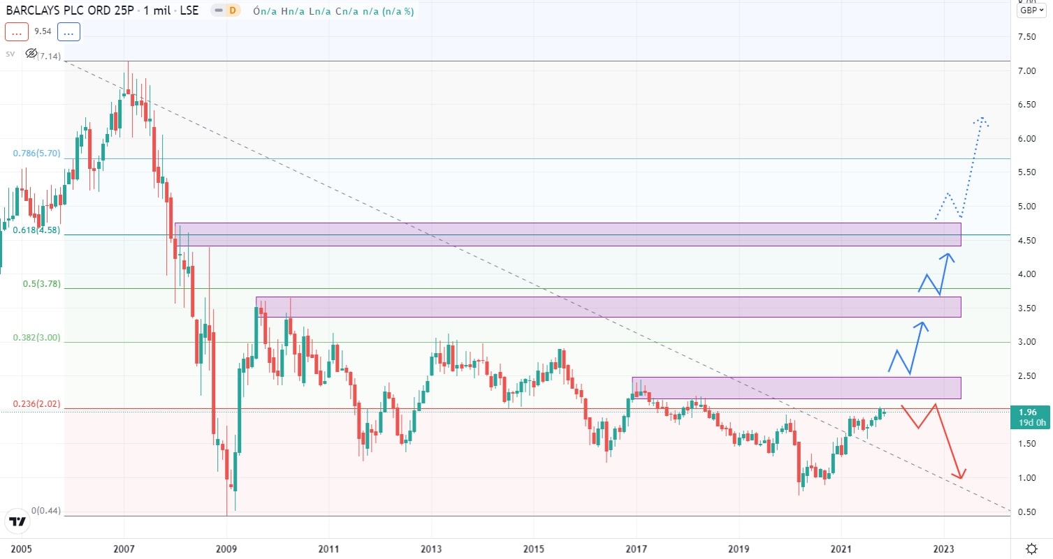Od března roku 2020 vykázala cena akcií Barclays nárůst o 175%. Vlivem takto silného posílení ceny akcií lze očekávat, že na současné rezistentní zóně dojde k částečnému výběru zisků z tohoto cenového pohybu, což by predikovalo krátkodobé oslabení (korekci).