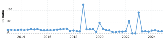 Historický vývoj P/E u Berkshire Hathaway