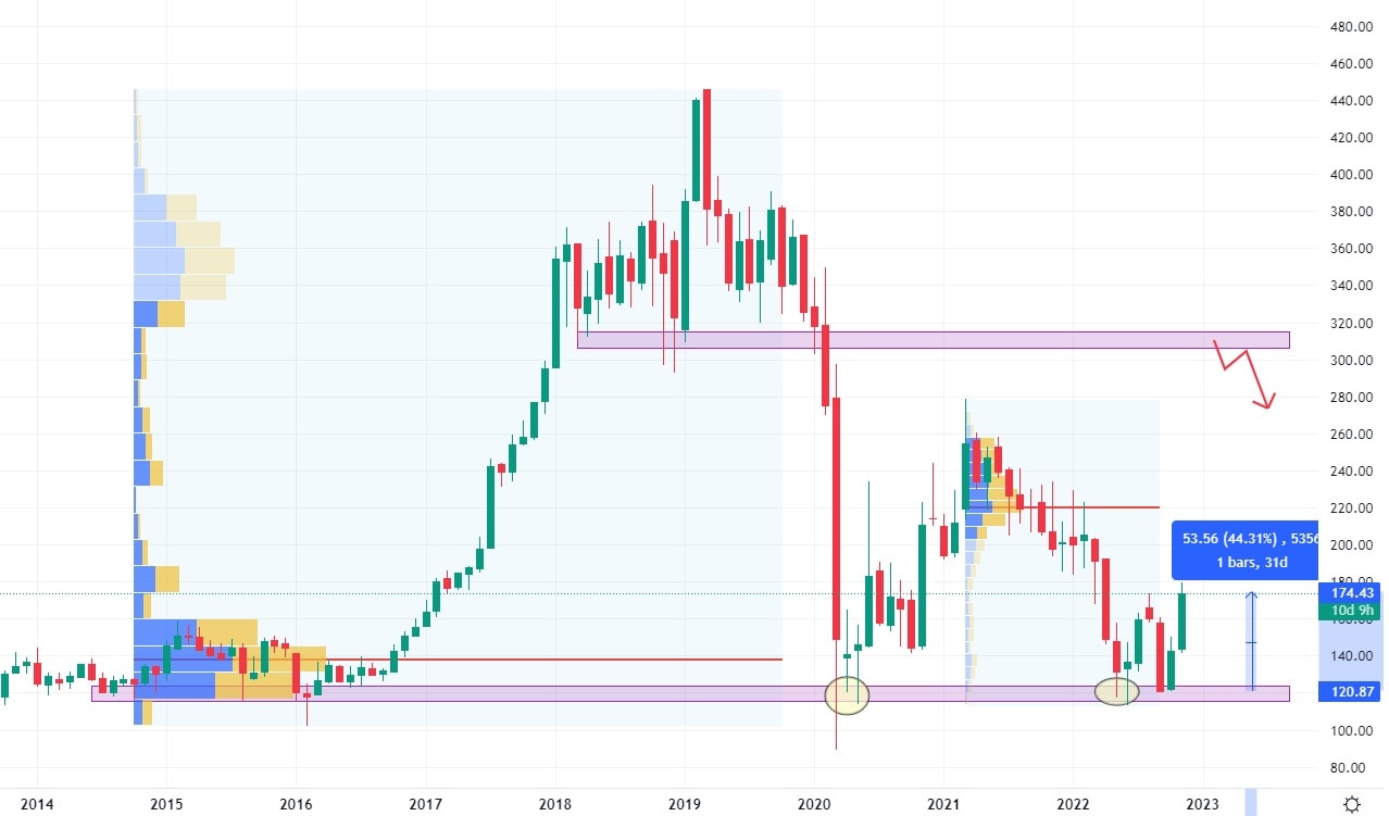 K oznámení o nákupu akcií CEO Boeingu došlo poté, co proběhla nákupní korekce na dlouhodobý support. I když byla tato zóna v minulosti již 2x testována, zafungovala její podpora i na třetí pokus. Tato nákupní reakce akcií Boeing do dnešních dní vyústila v posílení akcií o cca 44 % a především pokoření lokálních maxim. Nejbližší rezistence se nyní nachází na ceně 220 USD za akcii a je tvořena největším volume od roku 2021.