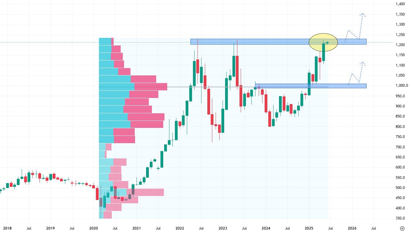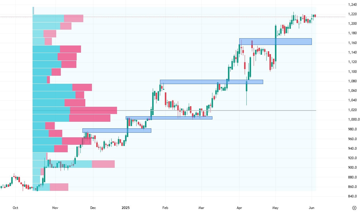 V takovém případě se nejbližší support nachází až na ceně 1 000 CZK, což je významná psychologická úroveň, ale také zde existuje konfluence v podobě největšího volume v rámci růstového trendu.