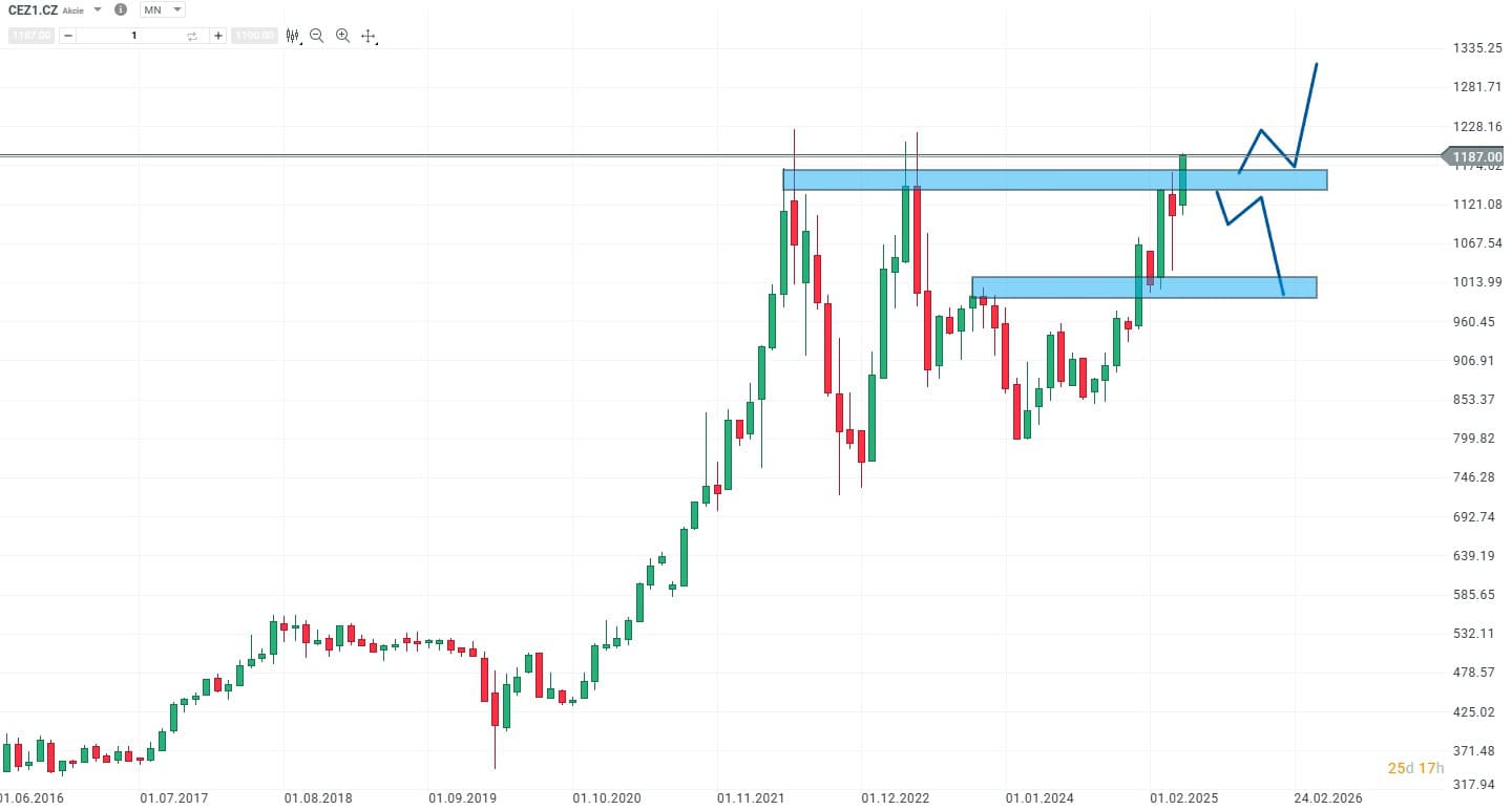 I díky poslednímu cenovému růstu akcie ČEZ nezadržitelně míří ke svým cenovým maximům.