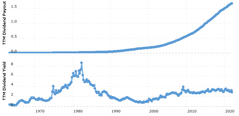 Pravdou ale je, že nesmíme zapomínat na inflaci, která je v USA momentálně na 40letých maximech. Nepokryje vám to tedy inflaci úplně, jenom částečně. Leč minulou dekádu se inflace pohybovala právě v blízkosti 2 %. V takovém případě jsou ty 2 – 4 % docela pěkný výnos. Minimálně jste měli jistotu, že vám to tu inflaci pokrylo. Momentální dividendový výnos činí v relativních číslech necelé 3 %.