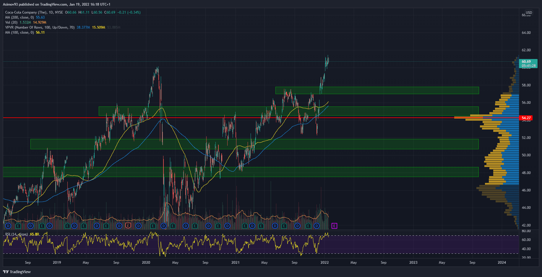 Jak ale vyplývá z textu výše, Coca-Cola je hlavně o té stabilitě a dividendách. Každopádně Coca-Cola dosáhla nového all time high a zatím se na těchto nových úrovních drží. Avšak setrvačnost kurzové expanze viditelně zeslábla. Teoreticky vzato se dveře pro pokračování v cenovém růstu otevřely dokořán. Nicméně korektivní pohyb by dával smysl.