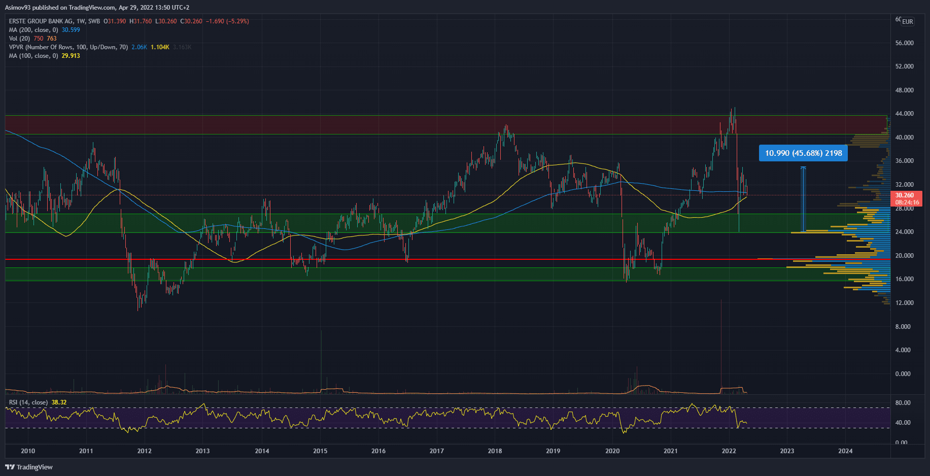 Akcie Erste Group Bank mají za sebou dost volatilníobdobí. Prvně strmý propad z února a následně rychlé vytažení ceny po odrazu od S/R levelu 25 EUR. Po odrazu akcie Erste velmi rychle vzrostly o více jak 45 %. Logická reakce trhu na předešlé panické výprodeje. Pak stačil jeden silný support a slušný odraz je na světě. Cenová expanze byla tedy rychlá, ale na druhou stranu ani dlouho netrvala. Postup kurzu se relativně rychle zastavil a od té chvíle trvá mírný pokles.